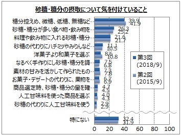 砂糖・糖分の摂取量・頻度について気を付けている人は5割強、女性や高年代層での比率が高い マイボイ…
