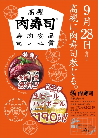 【高槻 肉寿司オープン】大阪に3店舗目となる『肉寿司』が9月28日(金)開店! 期間限定!生ビール&ハイボールが何杯飲んでも1杯190円、更に自慢の握りも1貫無料